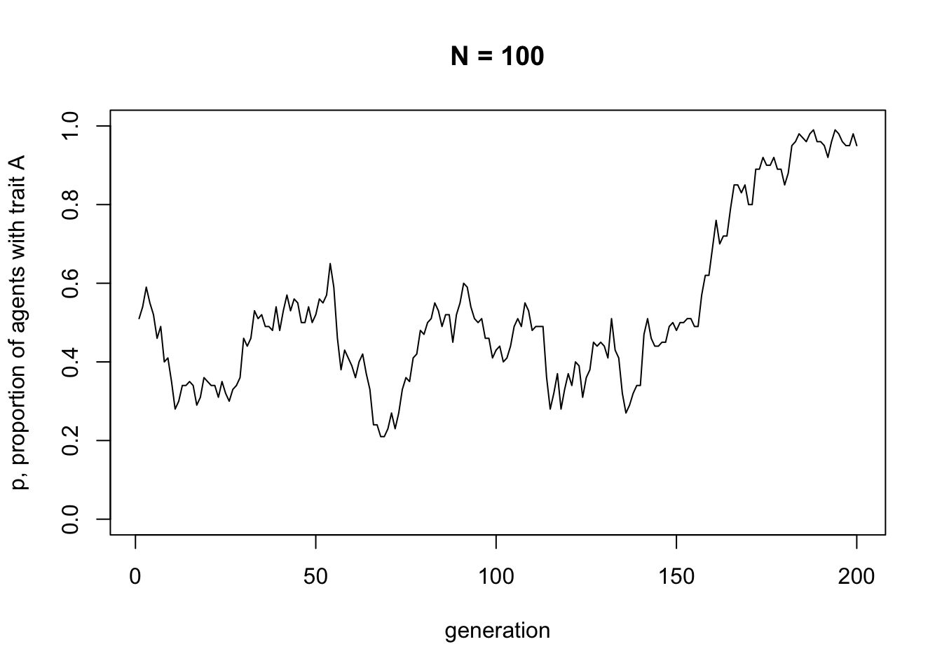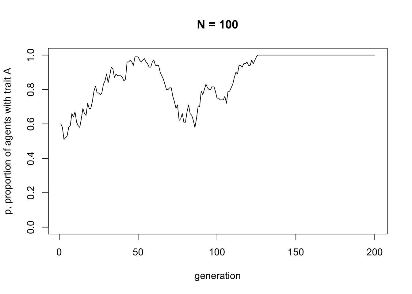 Unbiased transmission, or random copying, is by definition random, so different runs of this simulation will generate different plots. If you rerun all the code you’ll get something different again. It probably starts off hovering around 0.5, the approximate starting value of \(p\), and might go to 0 or 1 at some point. At \(p = 0\) there are no \(A\)s and every agent possesses \(B\). At \(p = 1\) there are no \(B\)s and every agent possesses \(A\). This is a typical feature of cultural drift, analogous to genetic drift: in small populations, with no selection or other directional processes operating, traits can be lost purely by chance.