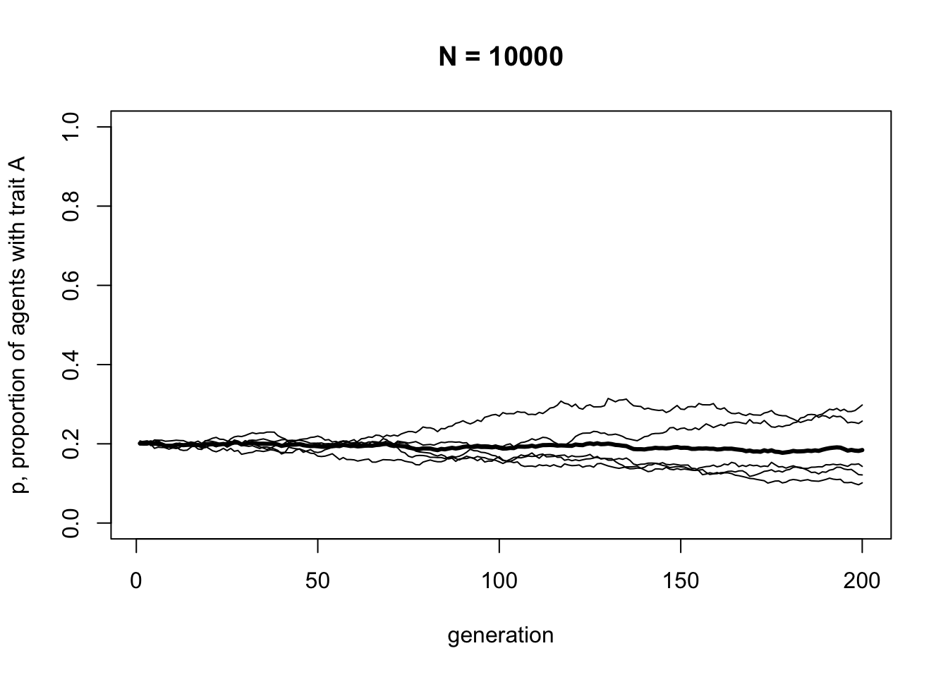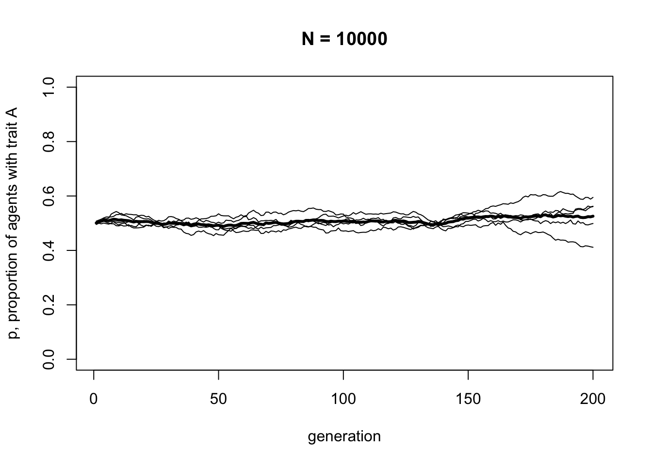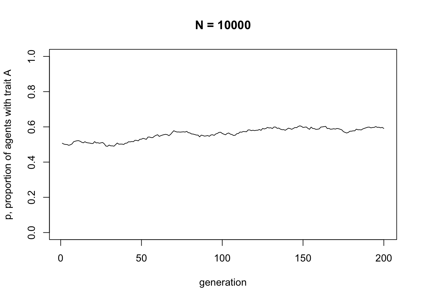 You should see much less fluctuation. Rarely in a population of \(N = 10000\) will either trait go to fixation.