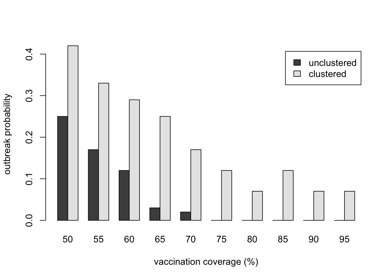 Here we have recreated Salathé & Bonhoeffer’s Figure 1c, albeit less perfectly given our smaller number of runs. The result should be qualitatively the same, however: outbreaks are less likely with greater vaccination coverage (larger \(c\)), but for each value of \(c\), outbreaks are more likely when there is opinion clustering (\(\Omega = 1\)) than with no opinion clustering (\(\Omega = 0\)). At high levels of vaccination (>80%), an unclustered population has achieved herd immunity, whereas a clustered population still suffers outbreaks.