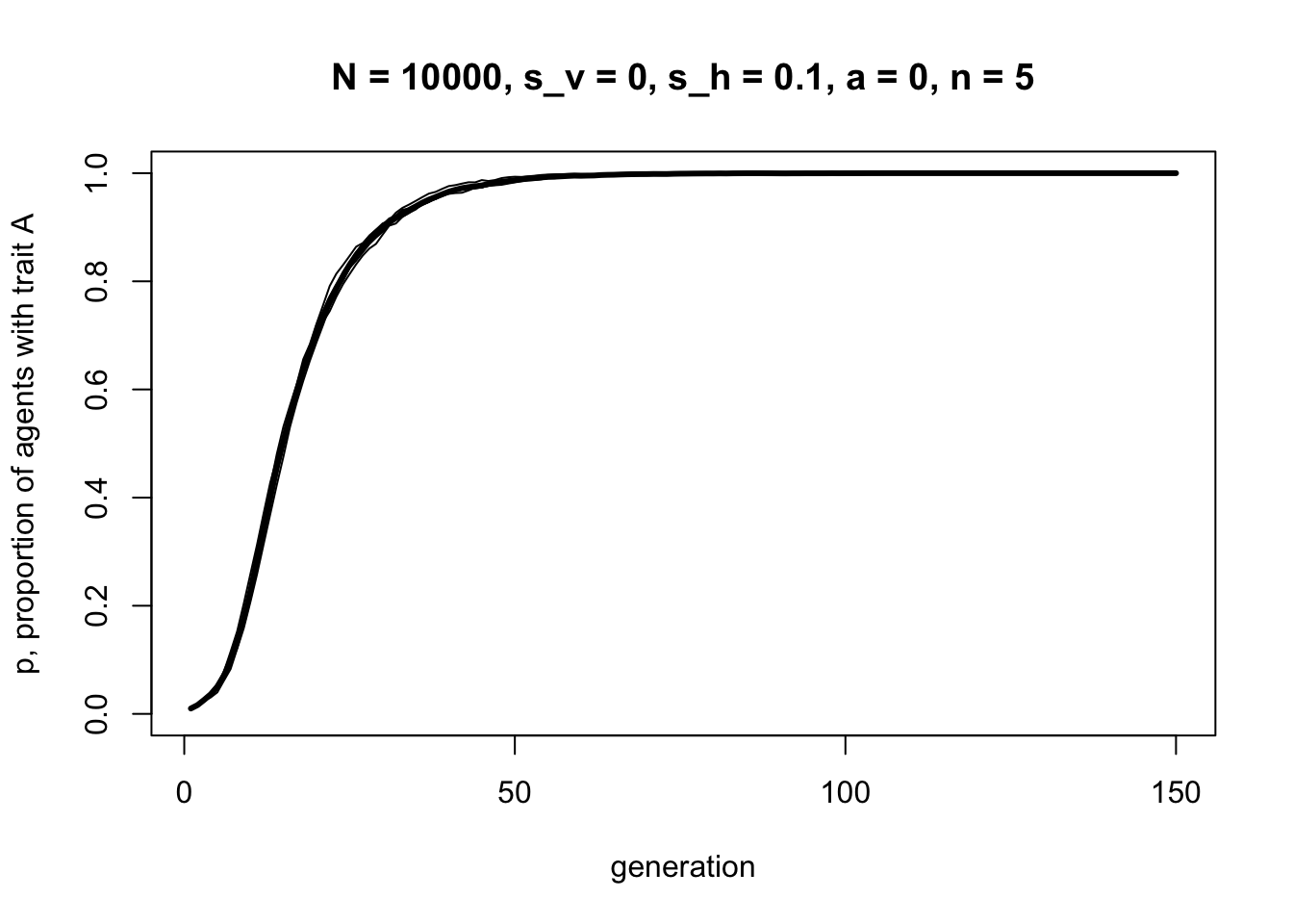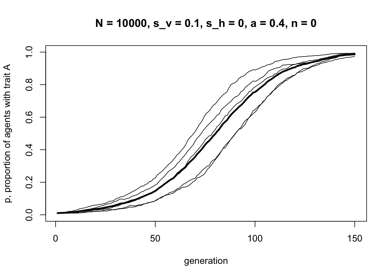 This looks a lot like the s-shaped curve we found in Model 3 for \(s = 0.1\). We have recapitulated unbiased transmission from Model 2 combined with biased transmission from Model 3, but assuming vertical cultural transmission from two parents, rather than randomly picking one demonstrator from the previous generation.