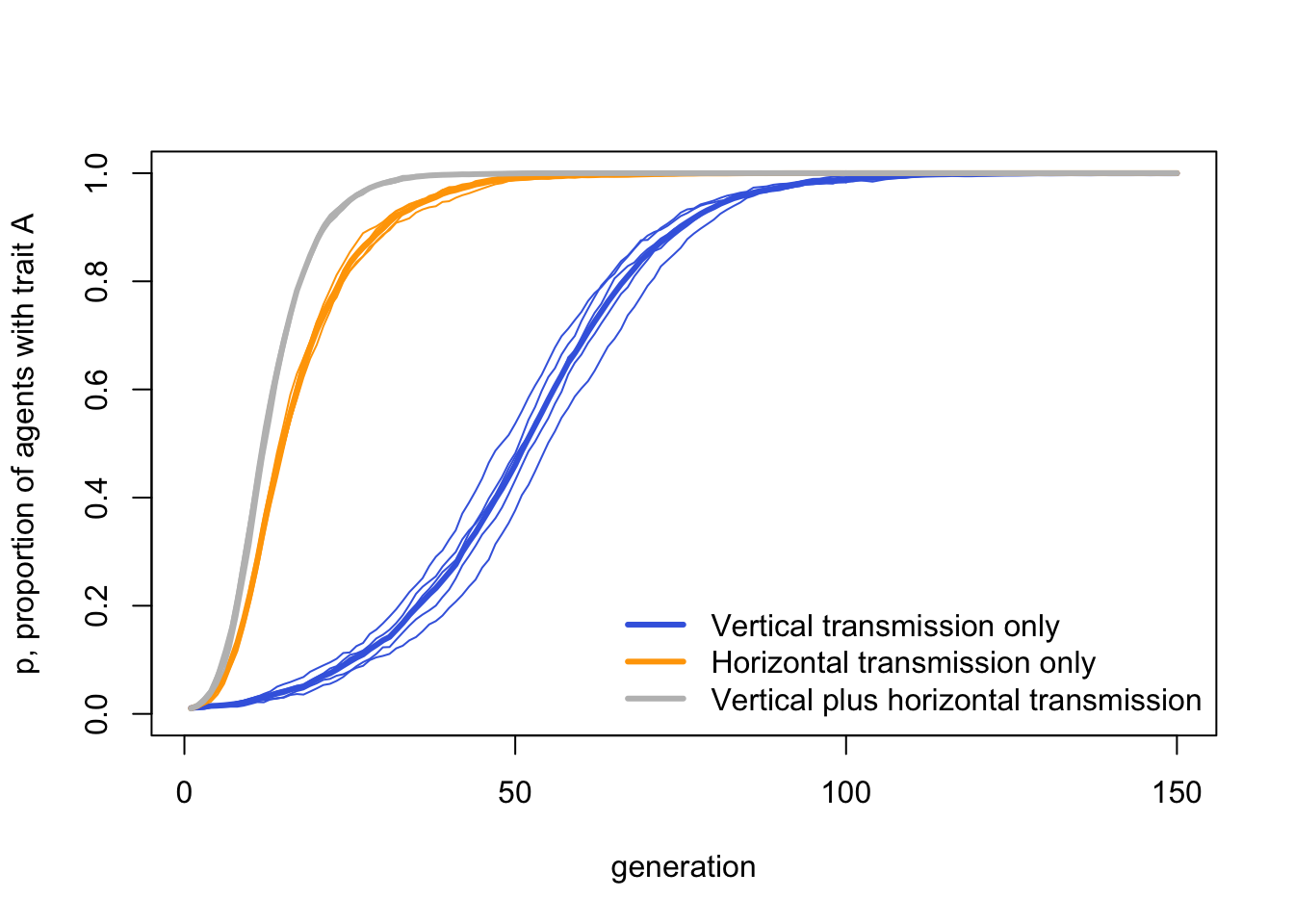 As we might expect, vertical plus horizontal transmission is fastest, with both forms of biased transmission combining together to favour \(A\). This is closely followed by horizontal transmission alone, which has the advantage of a large pool of demonstrators. The genetic-inheritance-like vertical transmission alone is slowest.